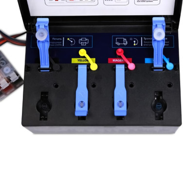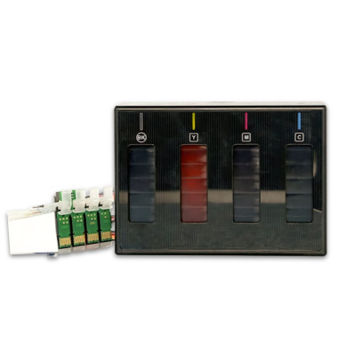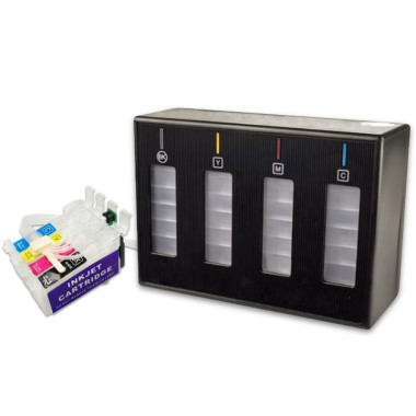 Чернила из резервуара подаются по силиконовому шлейфу в картриджи, установленные в принтере. Из картриджей печатающая головка принтера по необходимости прокачивает чернила для печати. По мере снижения уровня чернил, резервуар дозаправляется через заправочные отверстия. Виртуальный уровень чернил обнуляется на начальные значения нажатием на кнопку чипа.